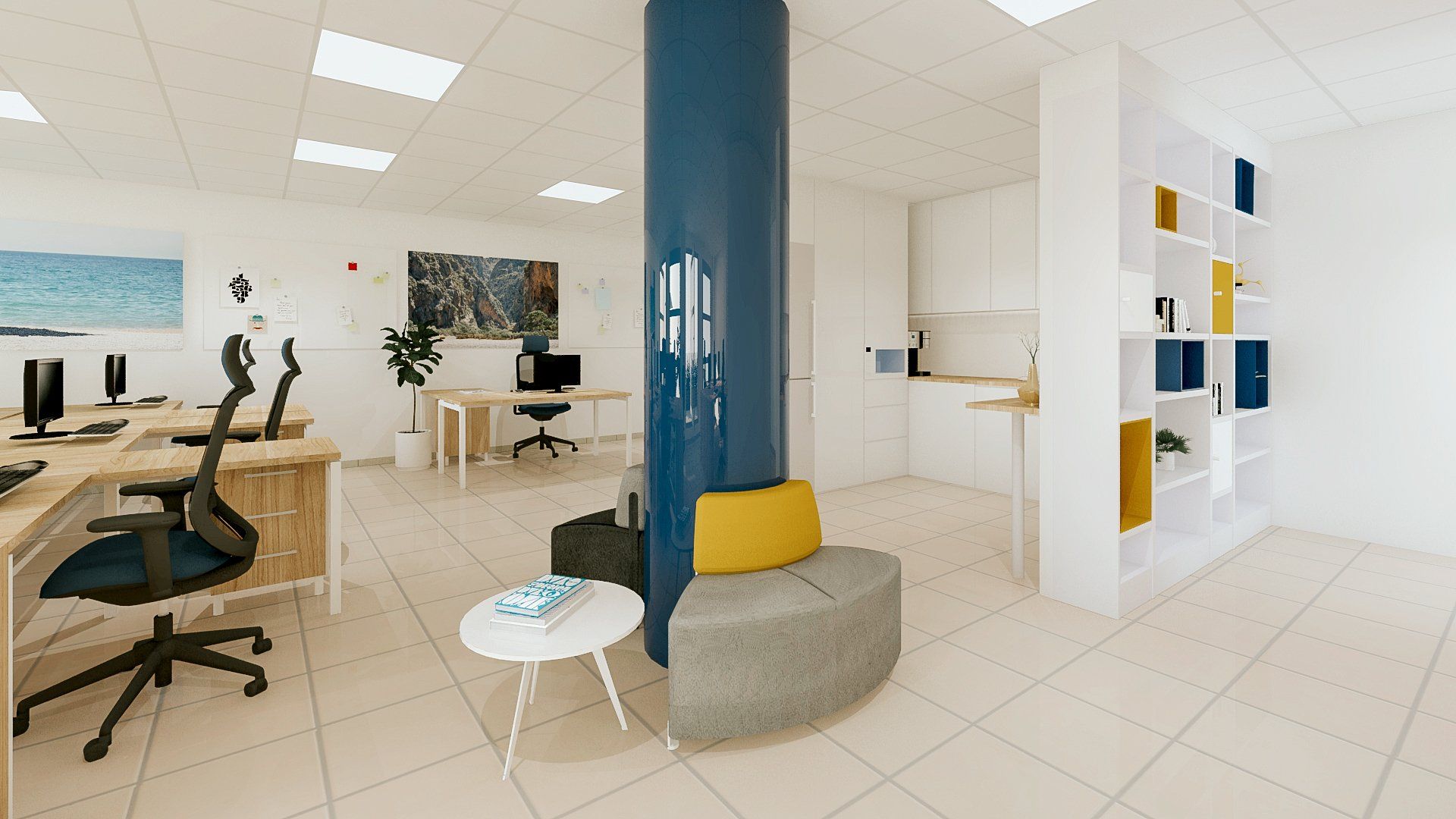 Office refurbishment, where an open workspace is integrated with a kitchen and relax area for workers.